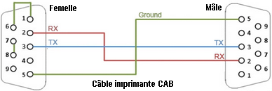 Un câble droit est utilisé pour raccorder un matériel DTE à un matériel DCE. Dans ce cas, les broches TXD-RXD et RTS-CTS ne sont pas croisées, d’où le terme câble droit.